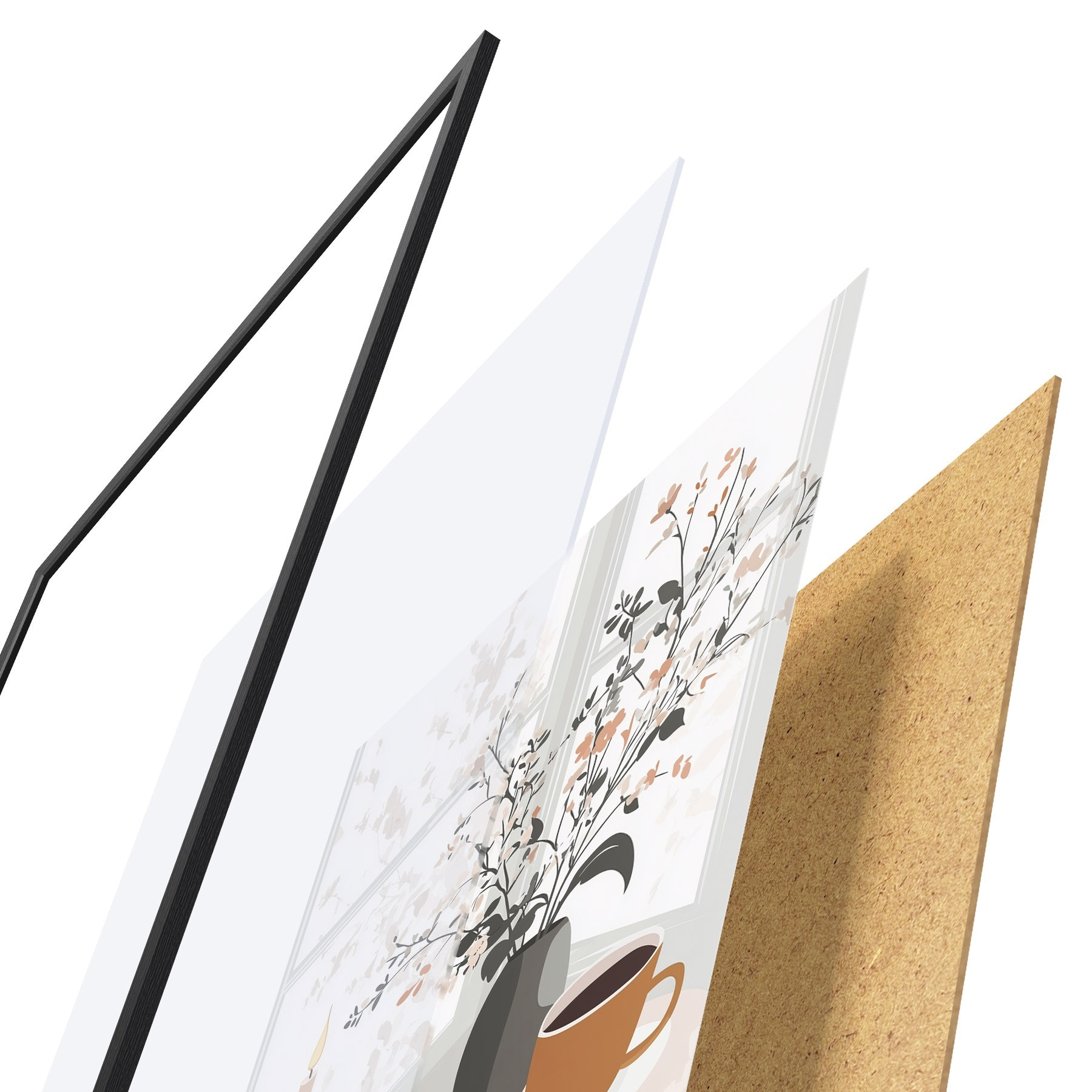 Das Poster besteht aus einem Rahmen, Plexiglas, einem gedruckten Bild und einer Rückwand aus Spanplatten. Dank der Halterungen auf der Rückseite kann das Poster sofort an die Wand gehängt werden.