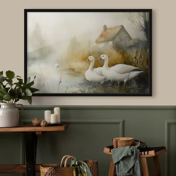 Poster Gänse im See in der Nähe des Bauernhauses, rustikal, Aquarell-Stil f44022