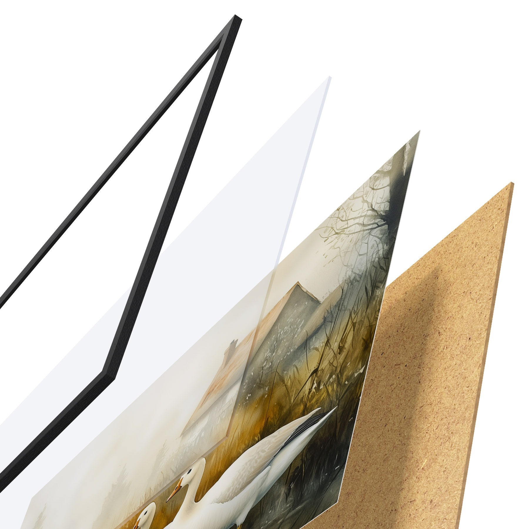 Das Poster besteht aus einem Rahmen, Plexiglas, einem gedruckten Bild und einer Rückwand aus Spanplatten. Dank der Halterungen auf der Rückseite kann das Poster sofort an die Wand gehängt werden.