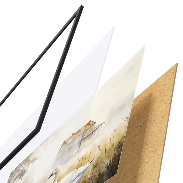 Das Poster besteht aus einem Rahmen, Plexiglas, einem gedruckten Bild und einer Rückwand aus Spanplatten. Dank der Halterungen auf der Rückseite kann das Poster sofort an die Wand gehängt werden.