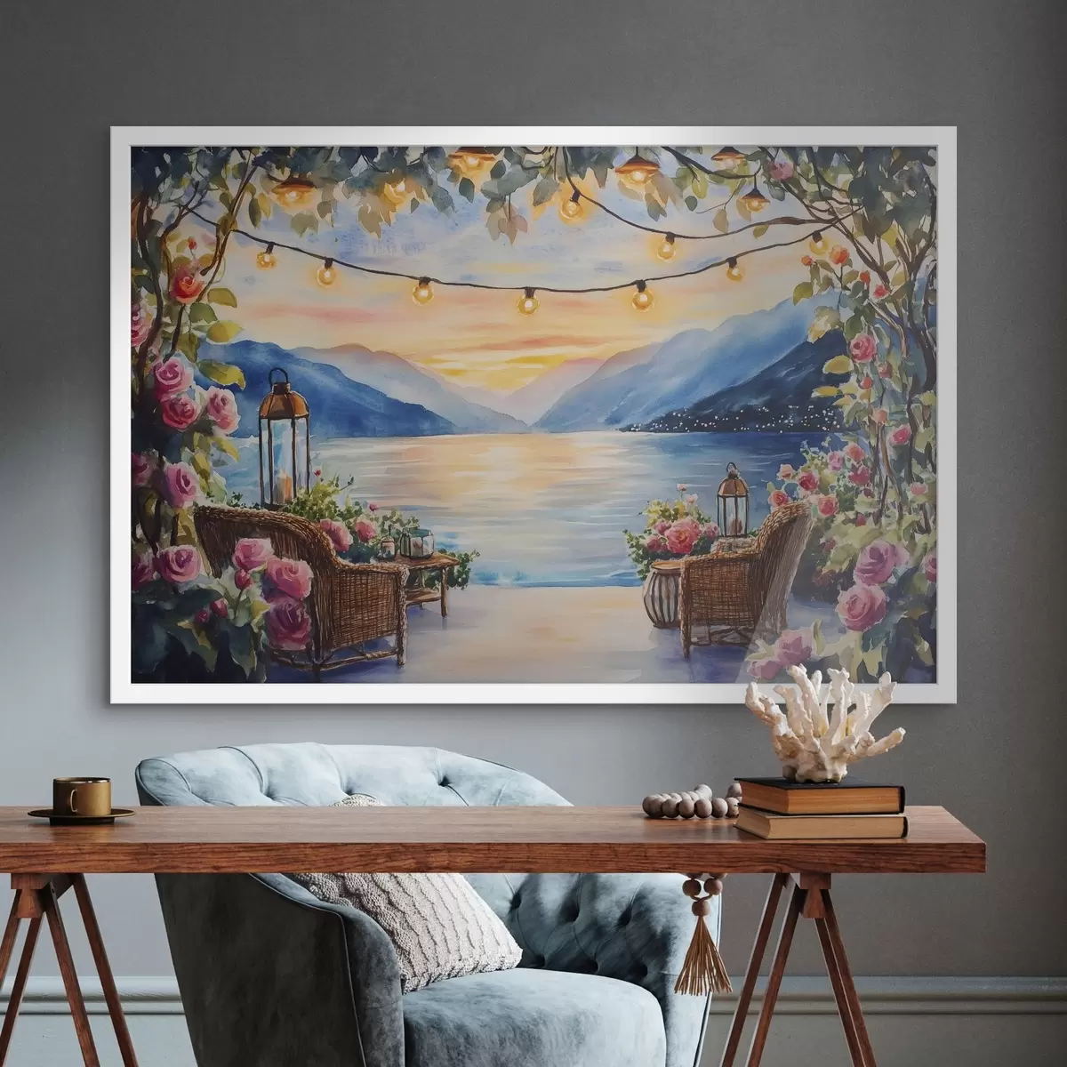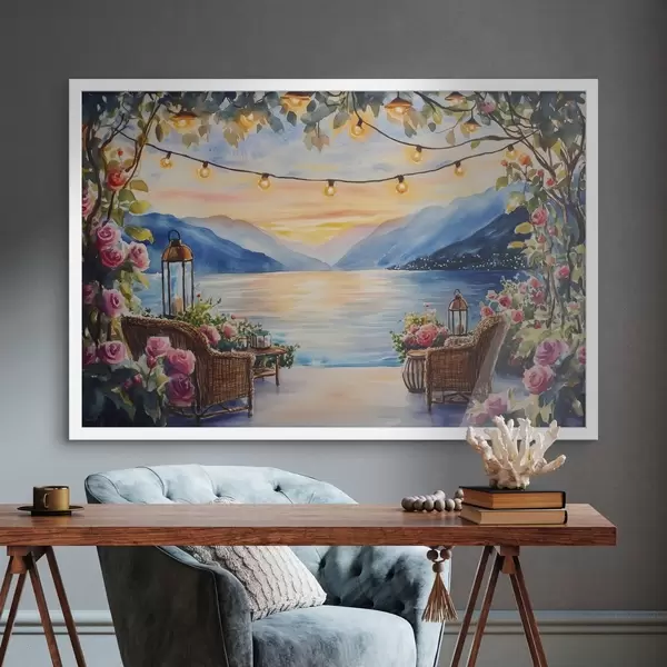 Poster Schöner Sonnenuntergang in den Bergen, See, Rosen, Boho-Stil Nr f44025