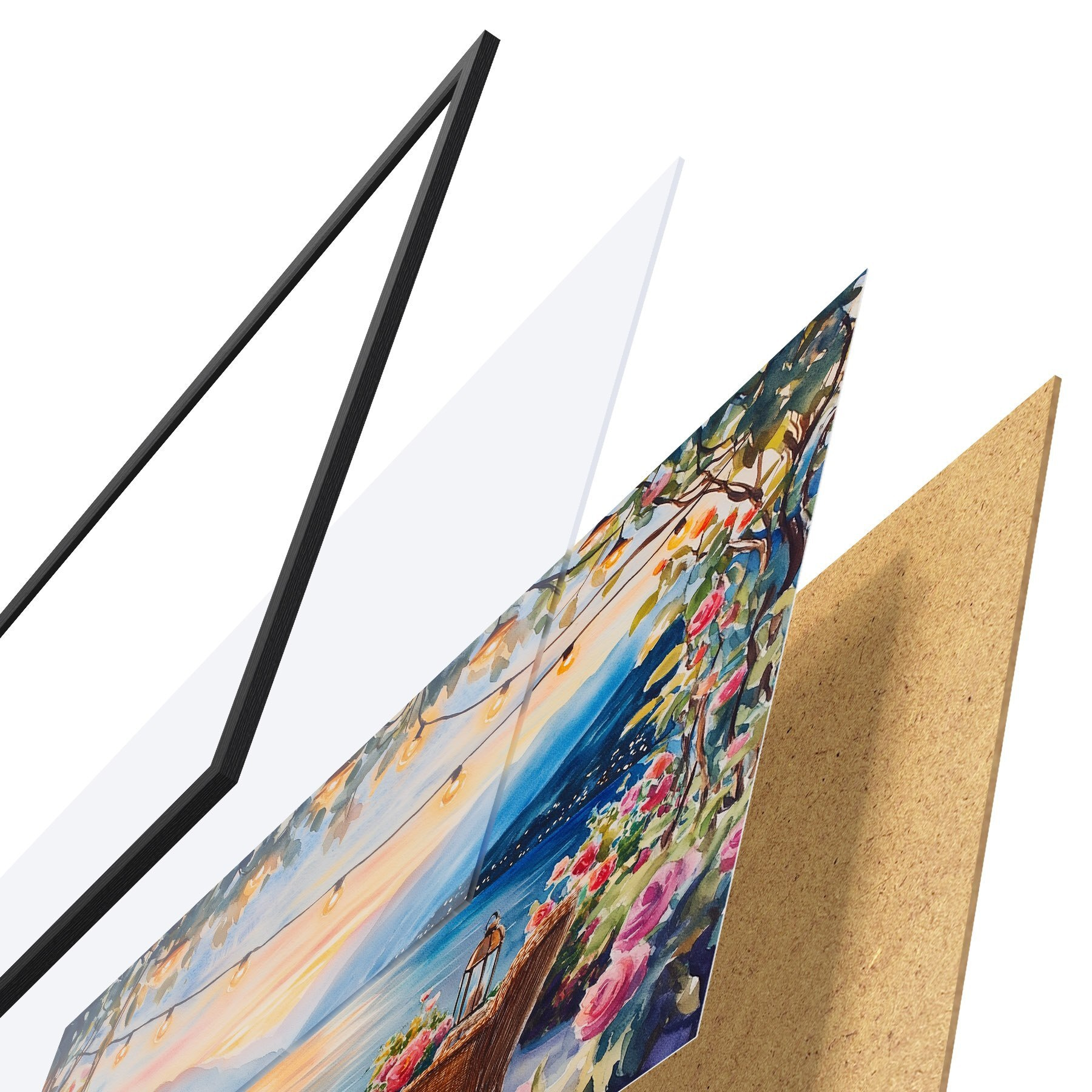 Das Poster besteht aus einem Rahmen, Plexiglas, einem gedruckten Bild und einer Rückwand aus Spanplatten. Dank der Halterungen auf der Rückseite kann das Poster sofort an die Wand gehängt werden.
