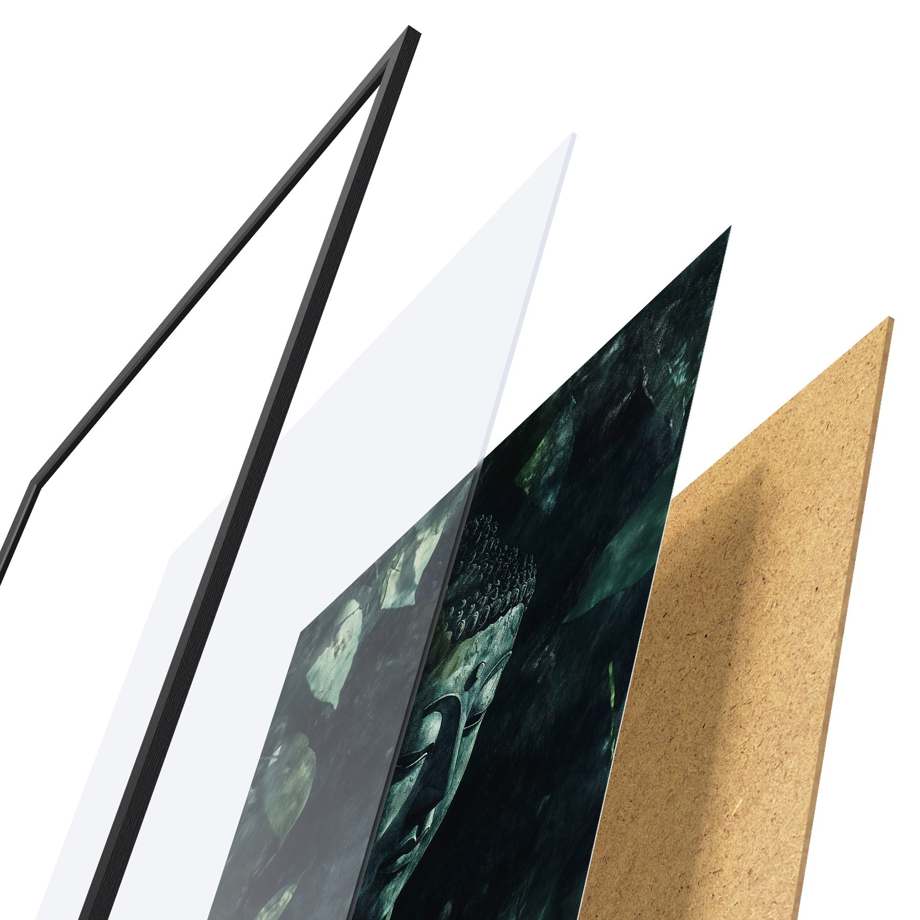 Das Poster besteht aus einem Rahmen, Plexiglas, einem gedruckten Bild und einer Rückwand aus Spanplatten. Dank der Halterungen auf der Rückseite kann das Poster sofort an die Wand gehängt werden.