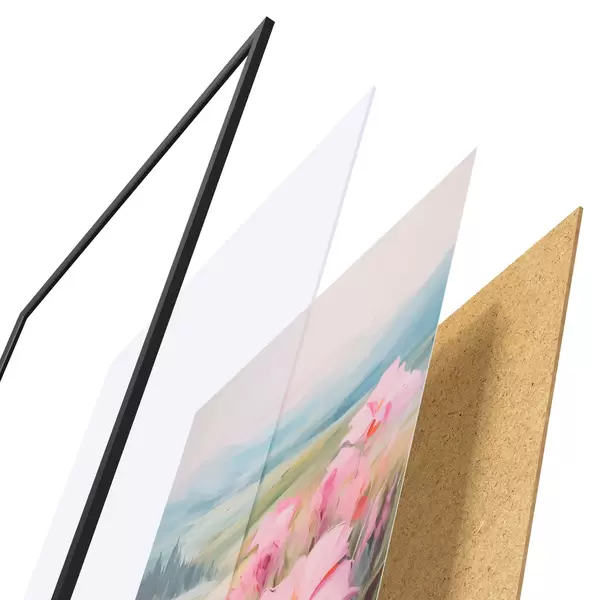 Das Poster besteht aus einem Rahmen, Plexiglas, einem gedruckten Bild und einer Rückwand aus Spanplatten. Dank der Halterungen auf der Rückseite kann das Poster sofort an die Wand gehängt werden.
