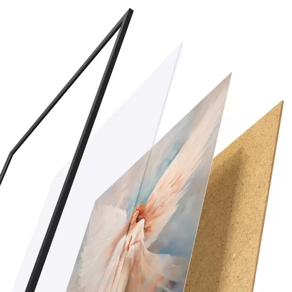 Das Poster besteht aus einem Rahmen, Plexiglas, einem gedruckten Bild und einer Rückwand aus Spanplatten. Dank der Halterungen auf der Rückseite kann das Poster sofort an die Wand gehängt werden.