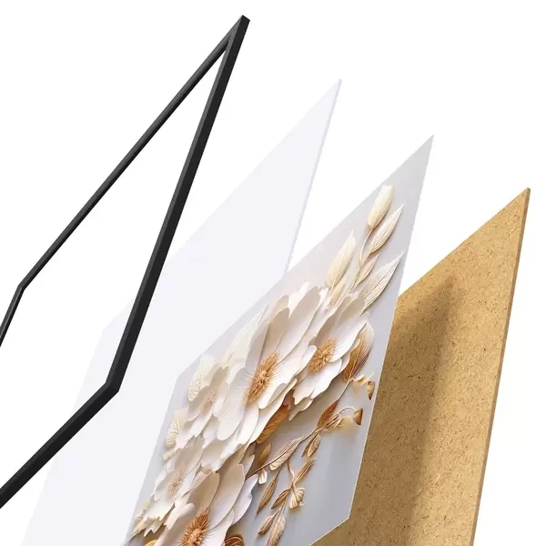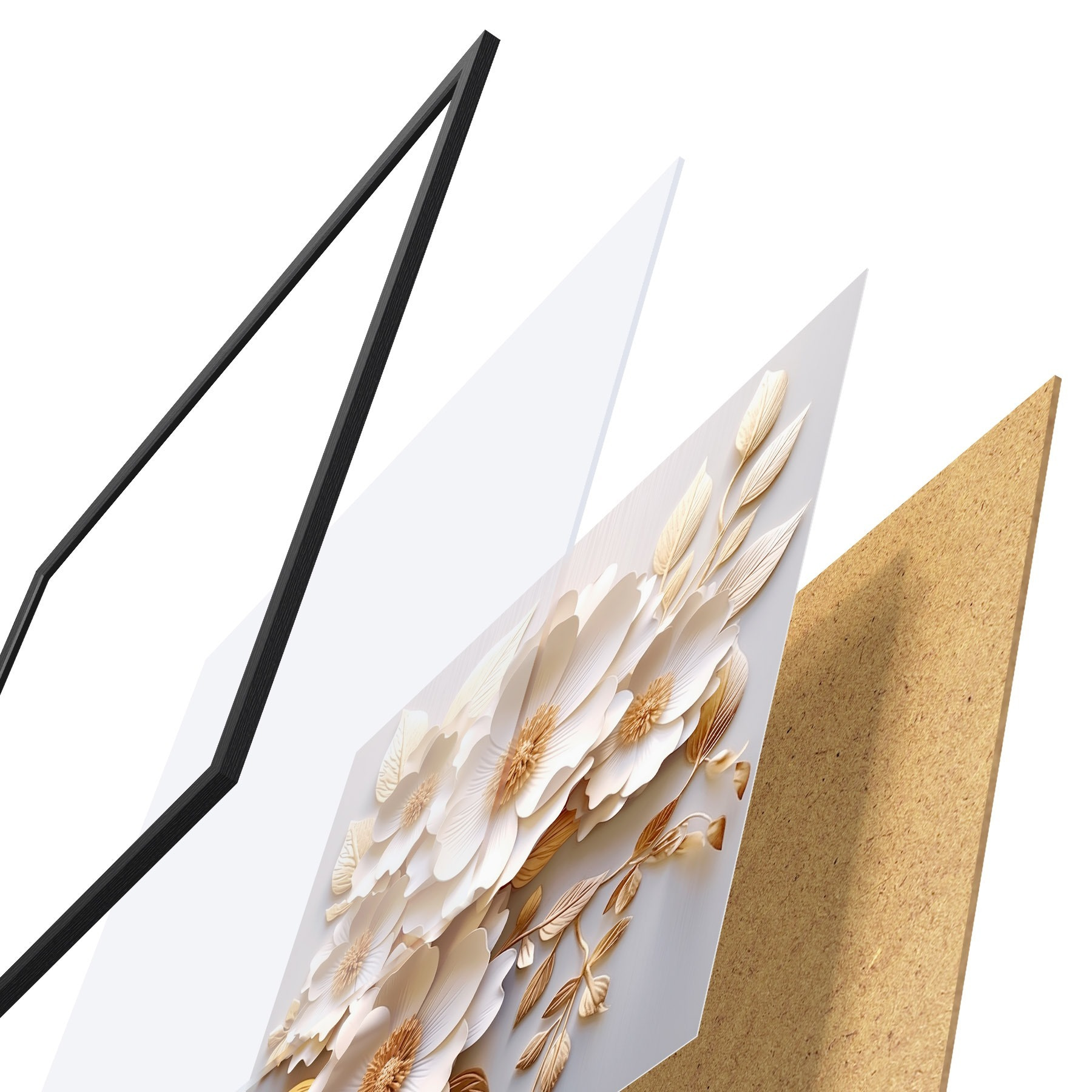 Das Poster besteht aus einem Rahmen, Plexiglas, einem gedruckten Bild und einer Rückwand aus Spanplatten. Dank der Halterungen auf der Rückseite kann das Poster sofort an die Wand gehängt werden.