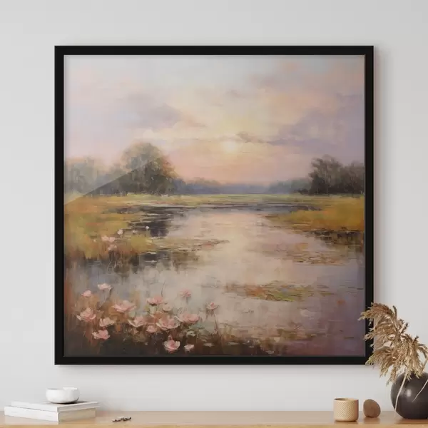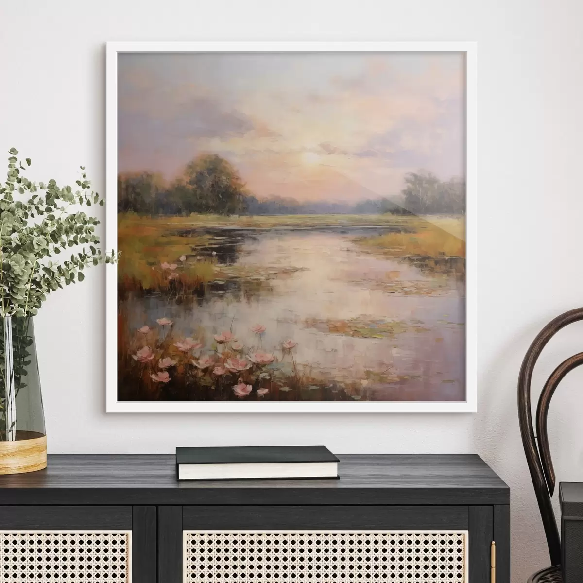 Poster Wasserfläche mit Blumen bei Sonnenuntergang Nr f44044