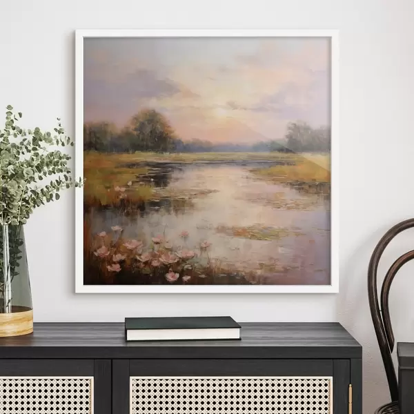 Poster Wasserfläche mit Blumen bei Sonnenuntergang f44044