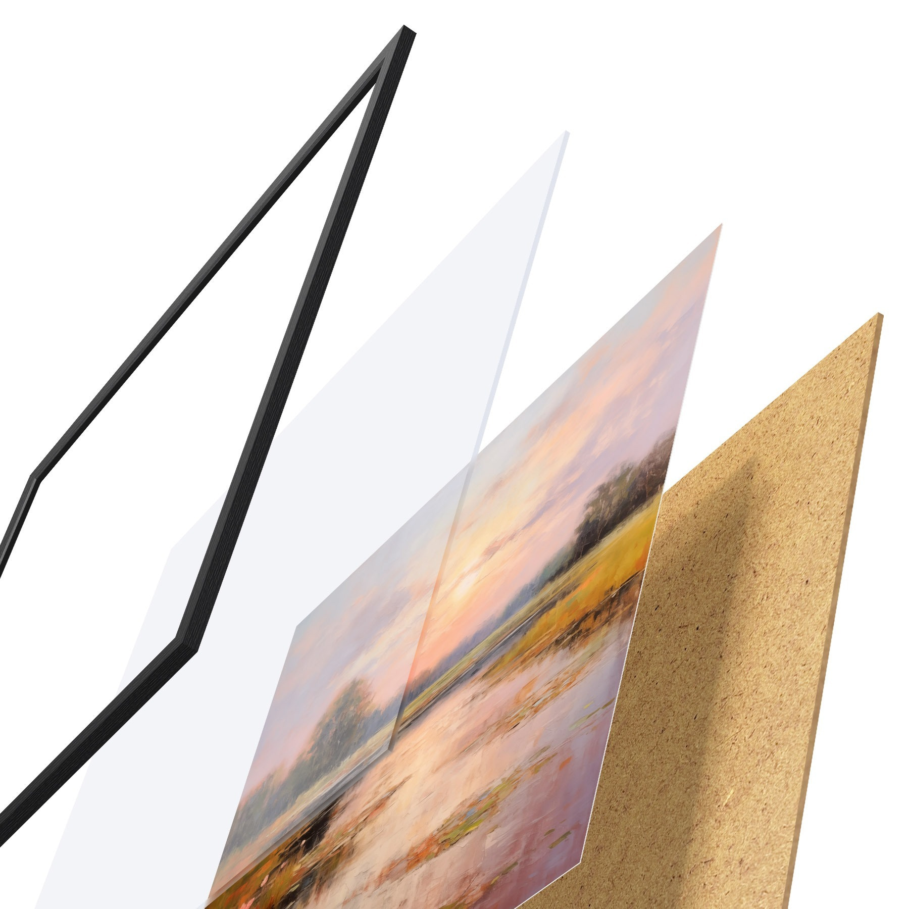 Das Poster besteht aus einem Rahmen, Plexiglas, einem gedruckten Bild und einer Rückwand aus Spanplatten. Dank der Halterungen auf der Rückseite kann das Poster sofort an die Wand gehängt werden.