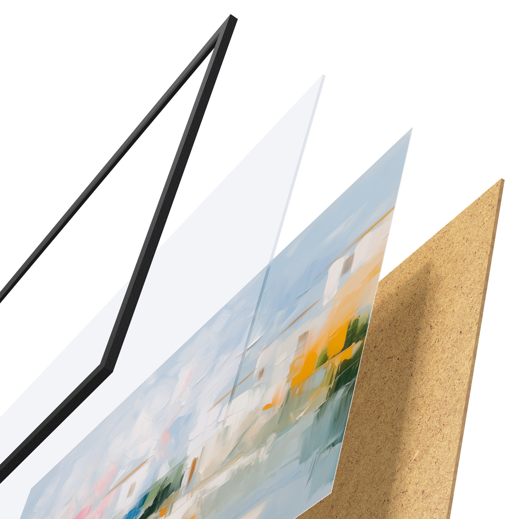 Das Poster besteht aus einem Rahmen, Plexiglas, einem gedruckten Bild und einer Rückwand aus Spanplatten. Dank der Halterungen auf der Rückseite kann das Poster sofort an die Wand gehängt werden.