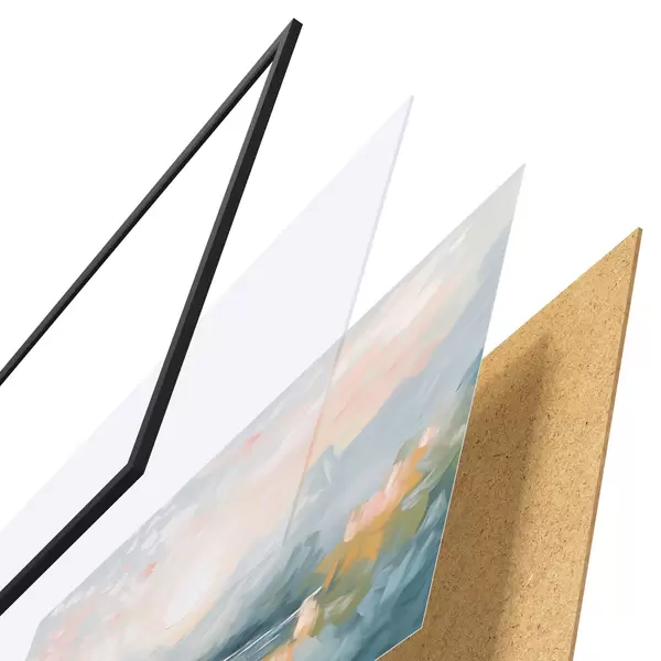 Das Poster besteht aus einem Rahmen, Plexiglas, einem gedruckten Bild und einer Rückwand aus Spanplatten. Dank der Halterungen auf der Rückseite kann das Poster sofort an die Wand gehängt werden.