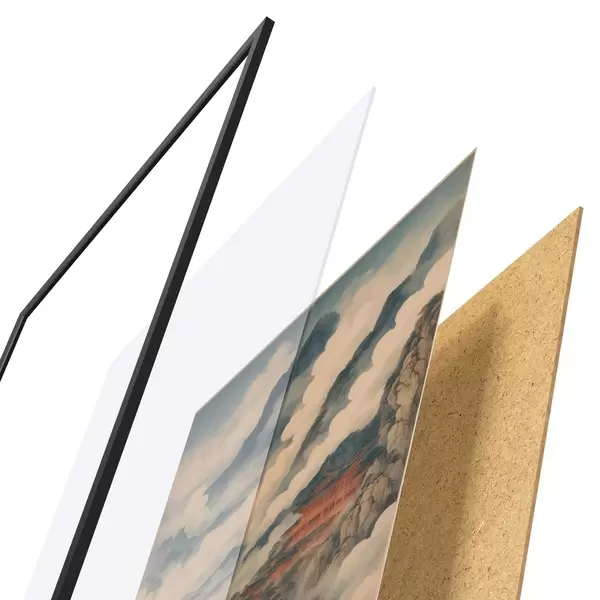 Das Poster besteht aus einem Rahmen, Plexiglas, einem gedruckten Bild und einer Rückwand aus Spanplatten. Dank der Halterungen auf der Rückseite kann das Poster sofort an die Wand gehängt werden.