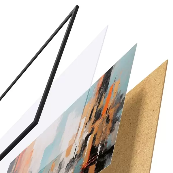 Das Poster besteht aus einem Rahmen, Plexiglas, einem gedruckten Bild und einer Rückwand aus Spanplatten. Dank der Halterungen auf der Rückseite kann das Poster sofort an die Wand gehängt werden.