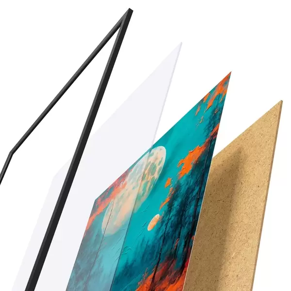 Das Poster besteht aus einem Rahmen, Plexiglas, einem gedruckten Bild und einer Rückwand aus Spanplatten. Dank der Halterungen auf der Rückseite kann das Poster sofort an die Wand gehängt werden.