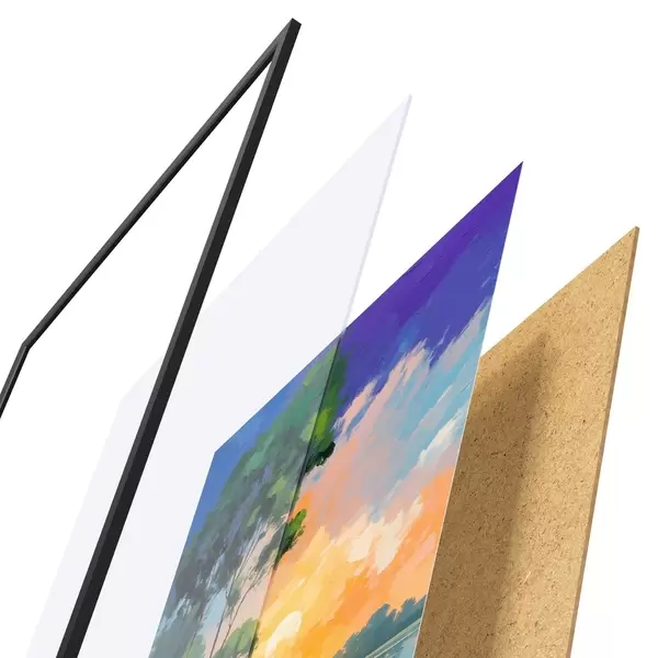 Das Poster besteht aus einem Rahmen, Plexiglas, einem gedruckten Bild und einer Rückwand aus Spanplatten. Dank der Halterungen auf der Rückseite kann das Poster sofort an die Wand gehängt werden.