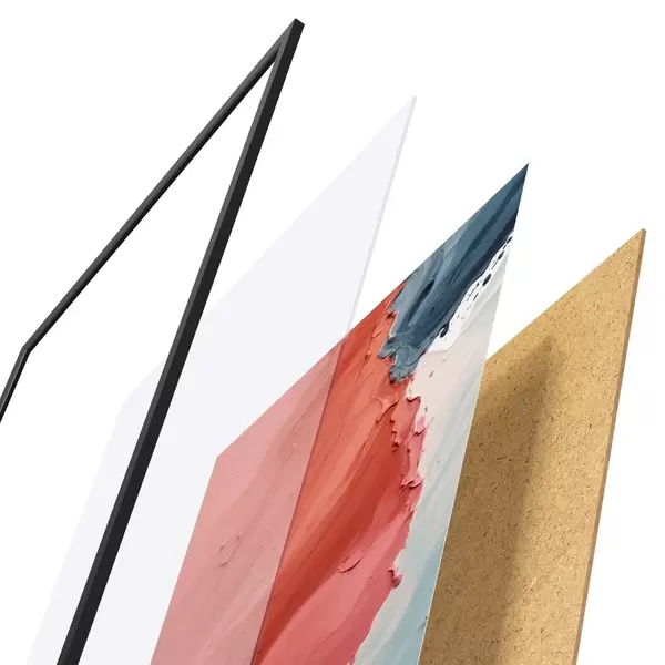 Das Poster besteht aus einem Rahmen, Plexiglas, einem gedruckten Bild und einer Rückwand aus Spanplatten. Dank der Halterungen auf der Rückseite kann das Poster sofort an die Wand gehängt werden.