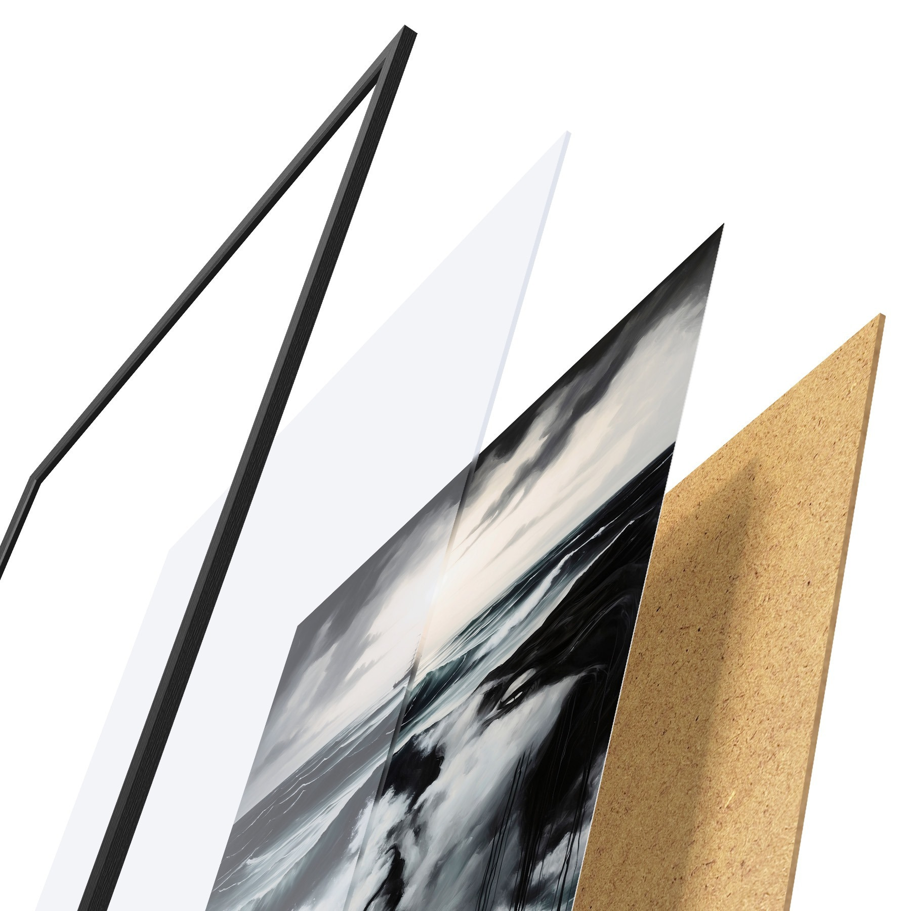 Das Poster besteht aus einem Rahmen, Plexiglas, einem gedruckten Bild und einer Rückwand aus Spanplatten. Dank der Halterungen auf der Rückseite kann das Poster sofort an die Wand gehängt werden.