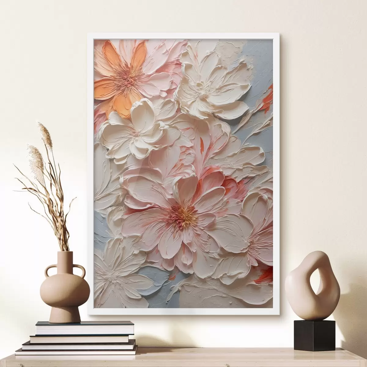 Poster Weiße und rosa Blumen auf blauem Hintergrund in Ölmalerei Stil f44074