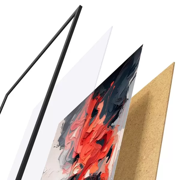 Das Poster besteht aus einem Rahmen, Plexiglas, einem gedruckten Bild und einer Rückwand aus Spanplatten. Dank der Halterungen auf der Rückseite kann das Poster sofort an die Wand gehängt werden.