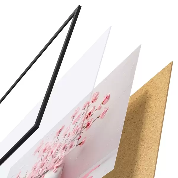 Das Poster besteht aus einem Rahmen, Plexiglas, einem gedruckten Bild und einer Rückwand aus Spanplatten. Dank der Halterungen auf der Rückseite kann das Poster sofort an die Wand gehängt werden.