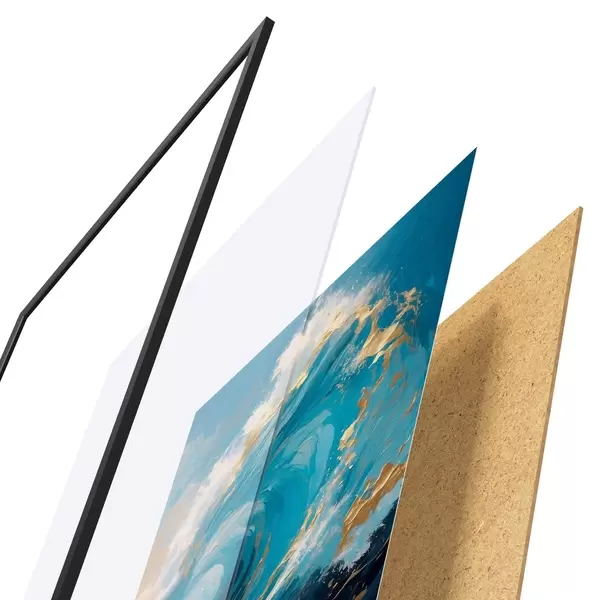 Das Poster besteht aus einem Rahmen, Plexiglas, einem gedruckten Bild und einer Rückwand aus Spanplatten. Dank der Halterungen auf der Rückseite kann das Poster sofort an die Wand gehängt werden.
