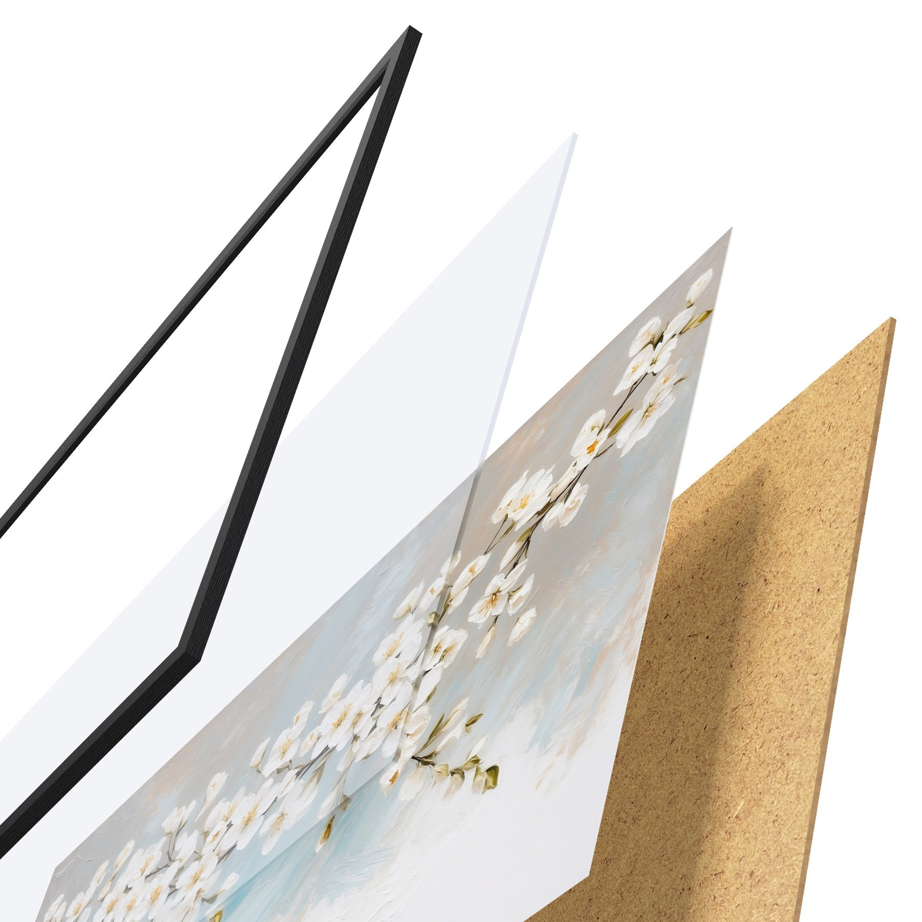 Das Poster besteht aus einem Rahmen, Plexiglas, einem gedruckten Bild und einer Rückwand aus Spanplatten. Dank der Halterungen auf der Rückseite kann das Poster sofort an die Wand gehängt werden.