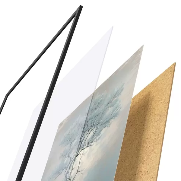 Das Poster besteht aus einem Rahmen, Plexiglas, einem gedruckten Bild und einer Rückwand aus Spanplatten. Dank der Halterungen auf der Rückseite kann das Poster sofort an die Wand gehängt werden.