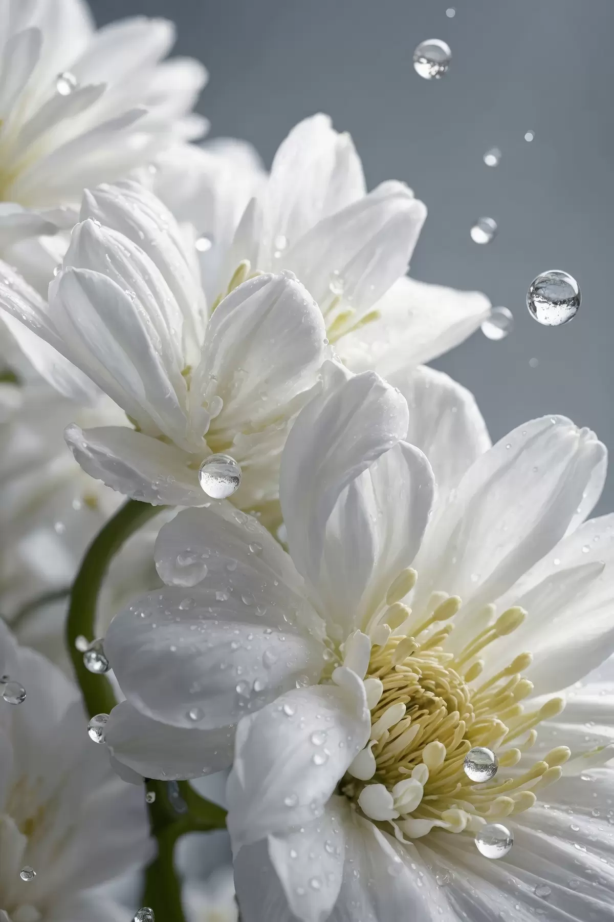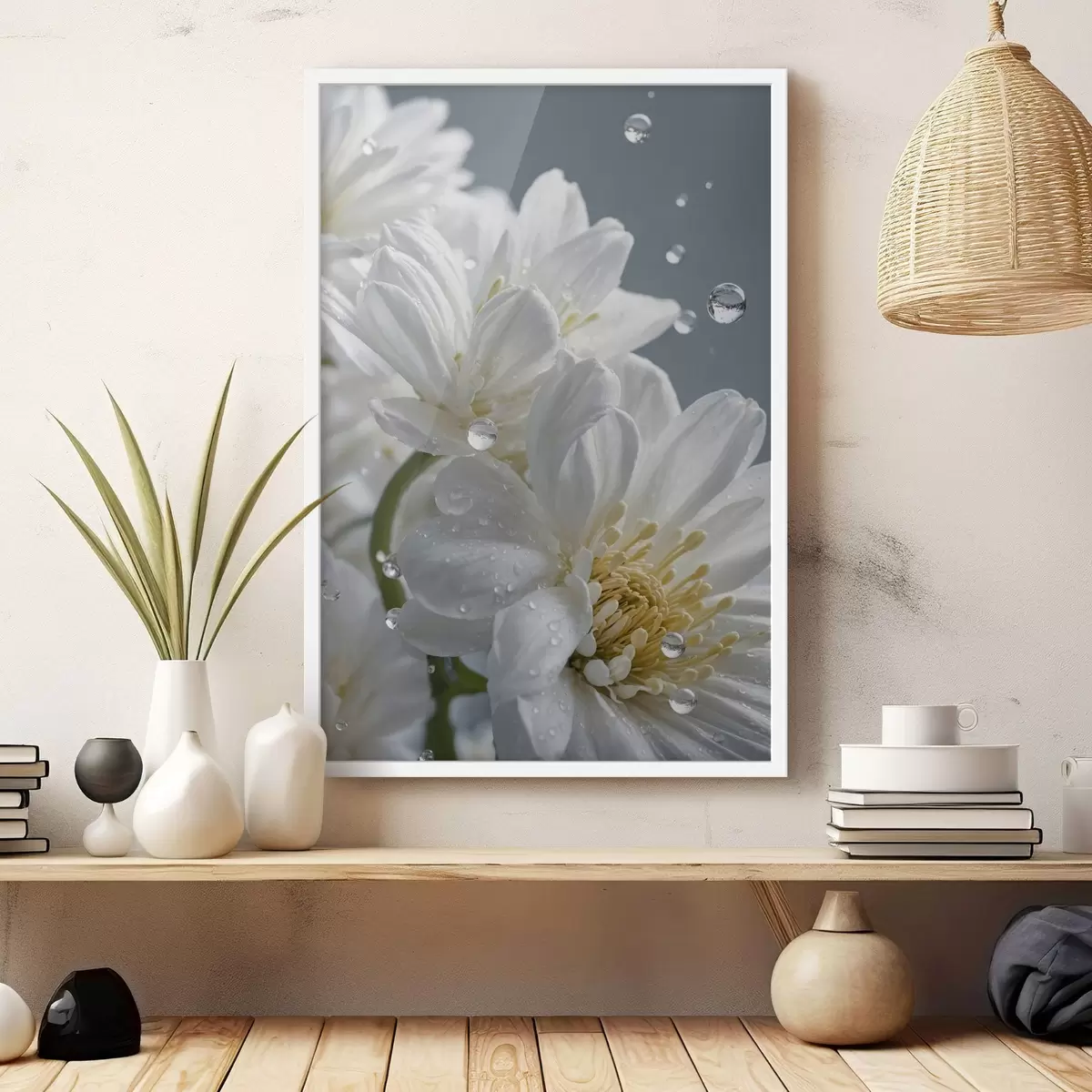 Poster Weiße Blumen mit Tau f44100