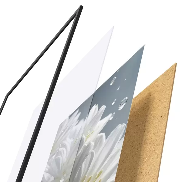 Das Poster besteht aus einem Rahmen, Plexiglas, einem gedruckten Bild und einer Rückwand aus Spanplatten. Dank der Halterungen auf der Rückseite kann das Poster sofort an die Wand gehängt werden.