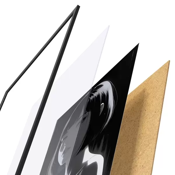 Das Poster besteht aus einem Rahmen, Plexiglas, einem gedruckten Bild und einer Rückwand aus Spanplatten. Dank der Halterungen auf der Rückseite kann das Poster sofort an die Wand gehängt werden.