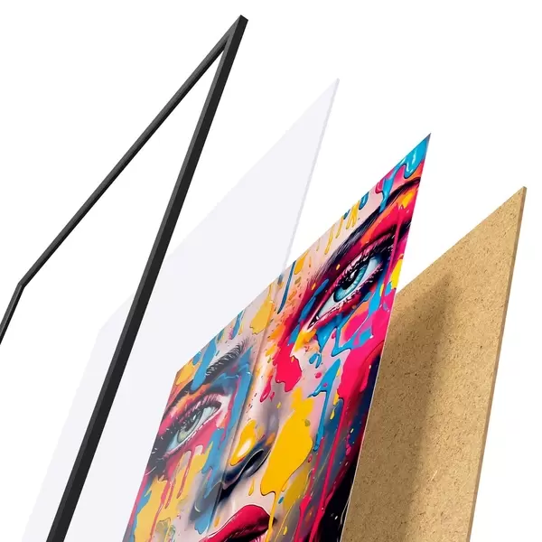 Das Poster besteht aus einem Rahmen, Plexiglas, einem gedruckten Bild und einer Rückwand aus Spanplatten. Dank der Halterungen auf der Rückseite kann das Poster sofort an die Wand gehängt werden.