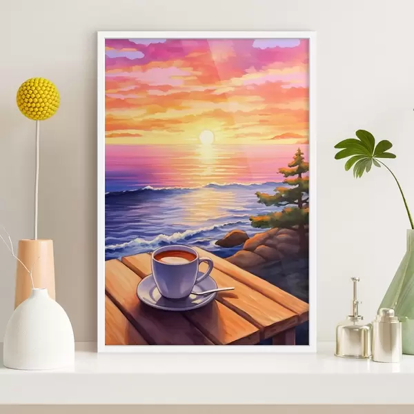 Poster Tasse Kaffee auf dem Hintergrund der Landschaft Nr f44105