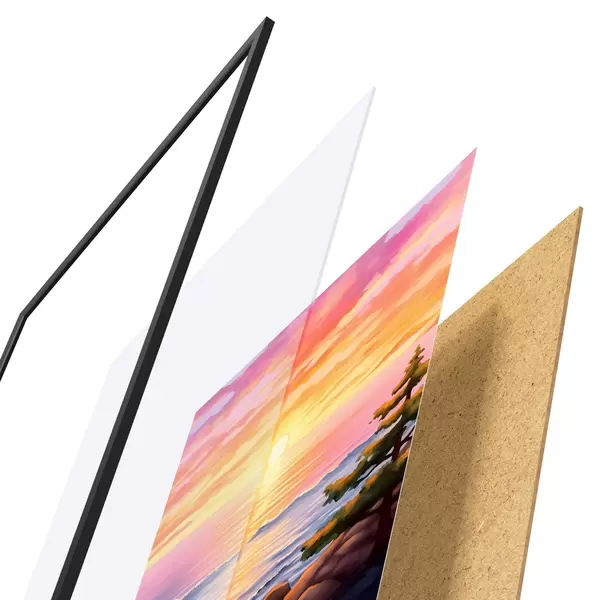 Das Poster besteht aus einem Rahmen, Plexiglas, einem gedruckten Bild und einer Rückwand aus Spanplatten. Dank der Halterungen auf der Rückseite kann das Poster sofort an die Wand gehängt werden.