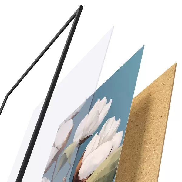Das Poster besteht aus einem Rahmen, Plexiglas, einem gedruckten Bild und einer Rückwand aus Spanplatten. Dank der Halterungen auf der Rückseite kann das Poster sofort an die Wand gehängt werden.