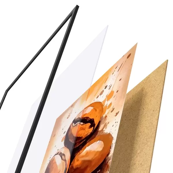 Das Poster besteht aus einem Rahmen, Plexiglas, einem gedruckten Bild und einer Rückwand aus Spanplatten. Dank der Halterungen auf der Rückseite kann das Poster sofort an die Wand gehängt werden.