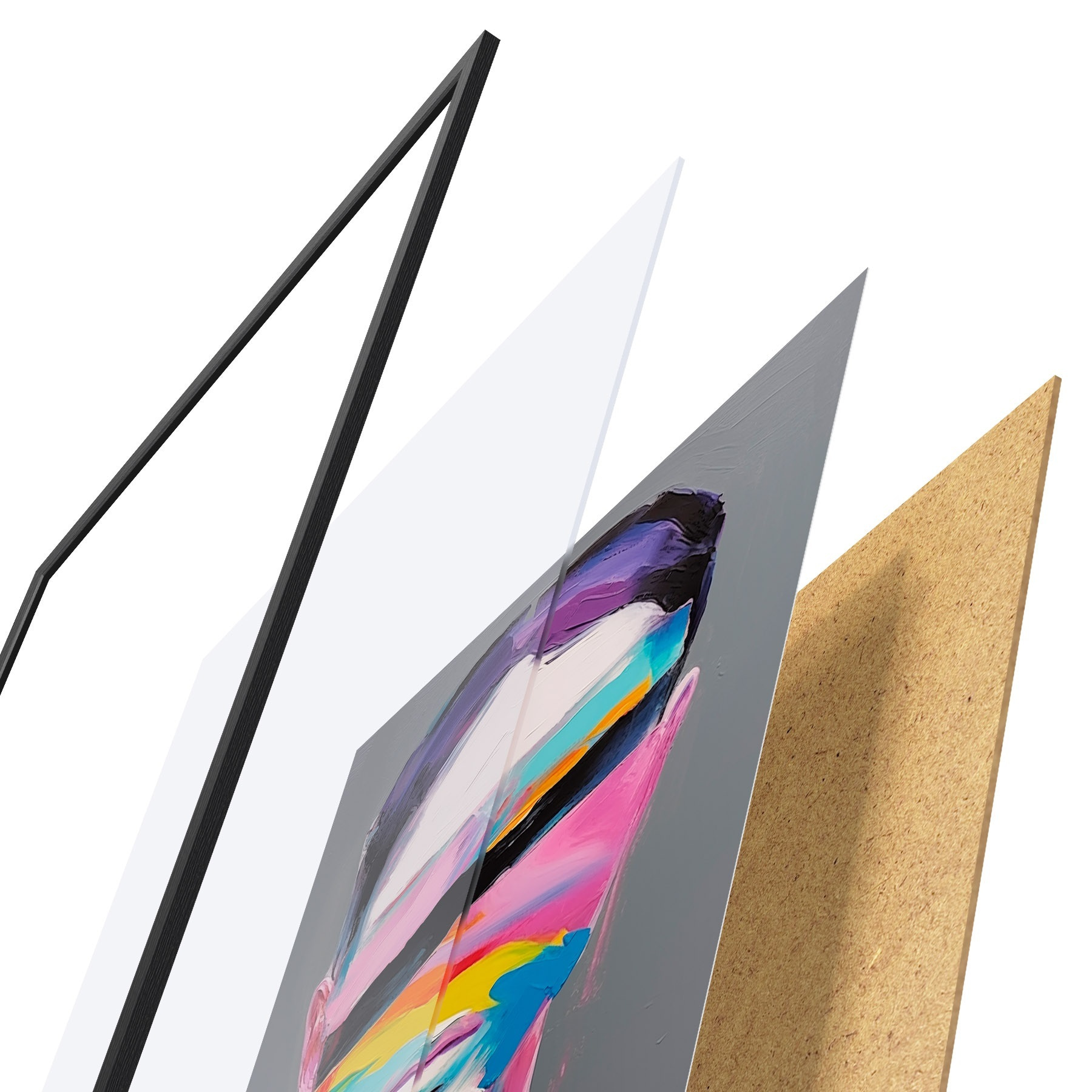 Das Poster besteht aus einem Rahmen, Plexiglas, einem gedruckten Bild und einer Rückwand aus Spanplatten. Dank der Halterungen auf der Rückseite kann das Poster sofort an die Wand gehängt werden.