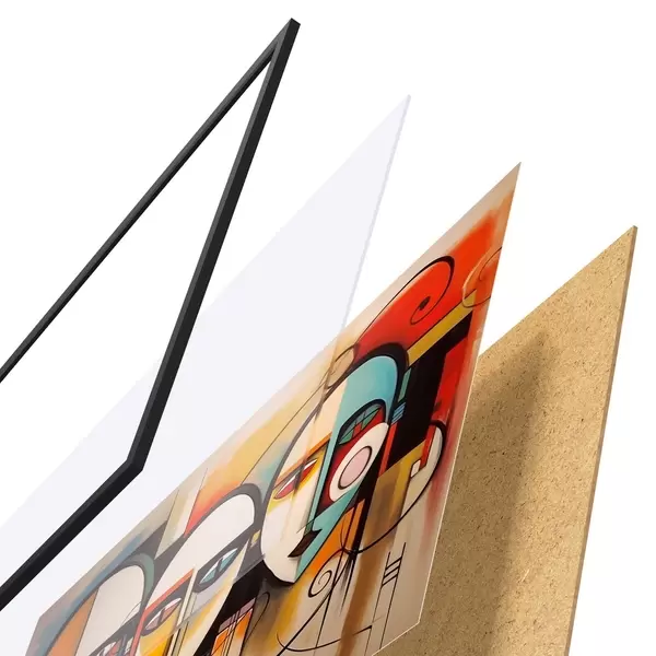 Das Poster besteht aus einem Rahmen, Plexiglas, einem gedruckten Bild und einer Rückwand aus Spanplatten. Dank der Halterungen auf der Rückseite kann das Poster sofort an die Wand gehängt werden.