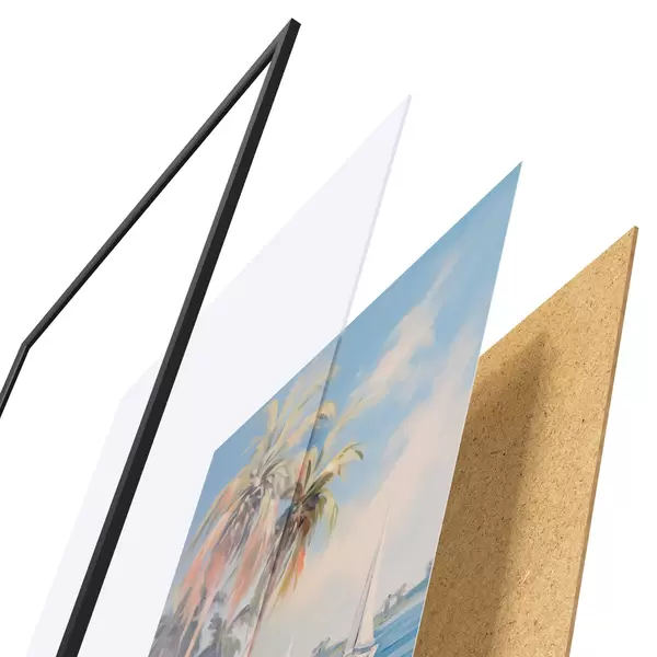 Das Poster besteht aus einem Rahmen, Plexiglas, einem gedruckten Bild und einer Rückwand aus Spanplatten. Dank der Halterungen auf der Rückseite kann das Poster sofort an die Wand gehängt werden.
