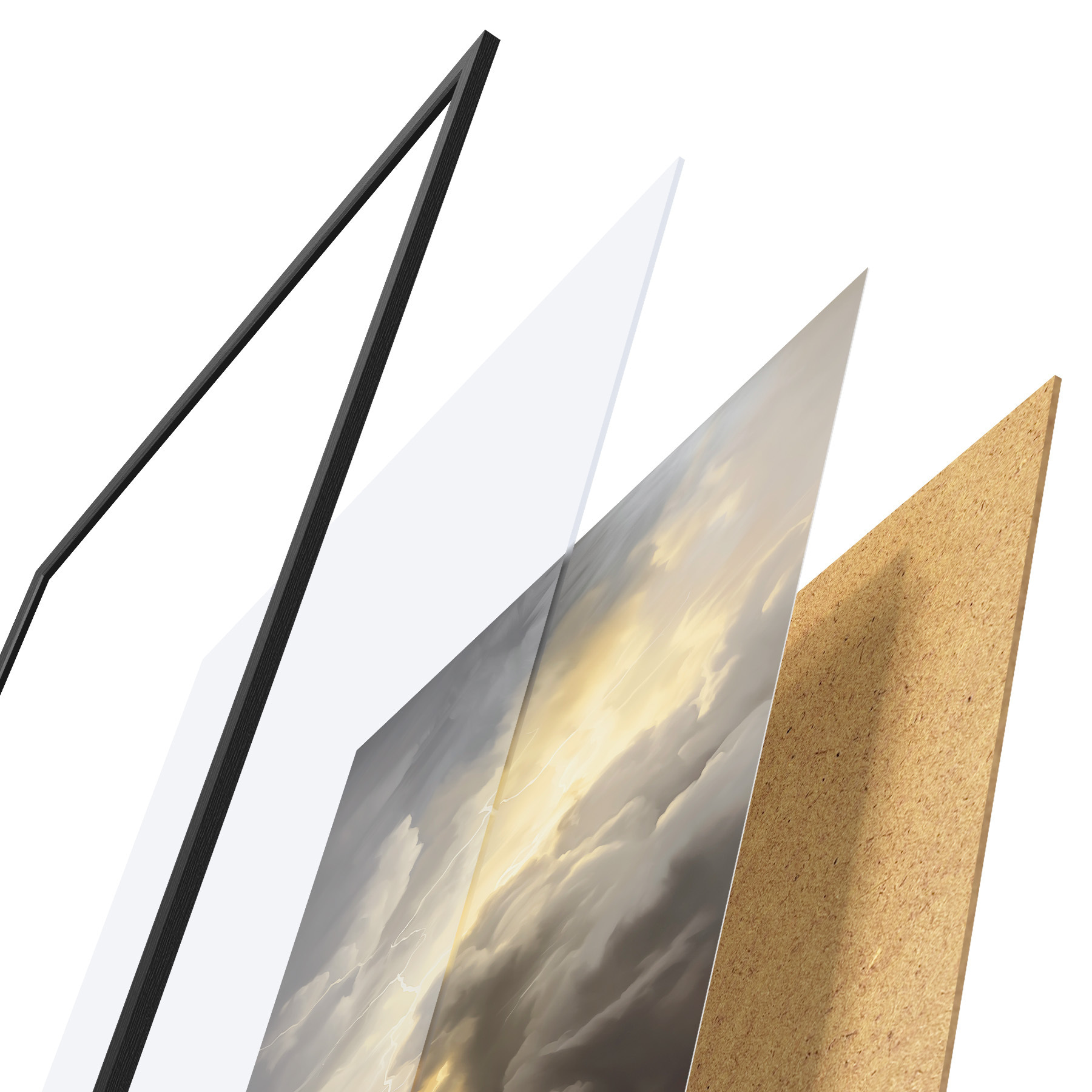 Das Poster besteht aus einem Rahmen, Plexiglas, einem gedruckten Bild und einer Rückwand aus Spanplatten. Dank der Halterungen auf der Rückseite kann das Poster sofort an die Wand gehängt werden.