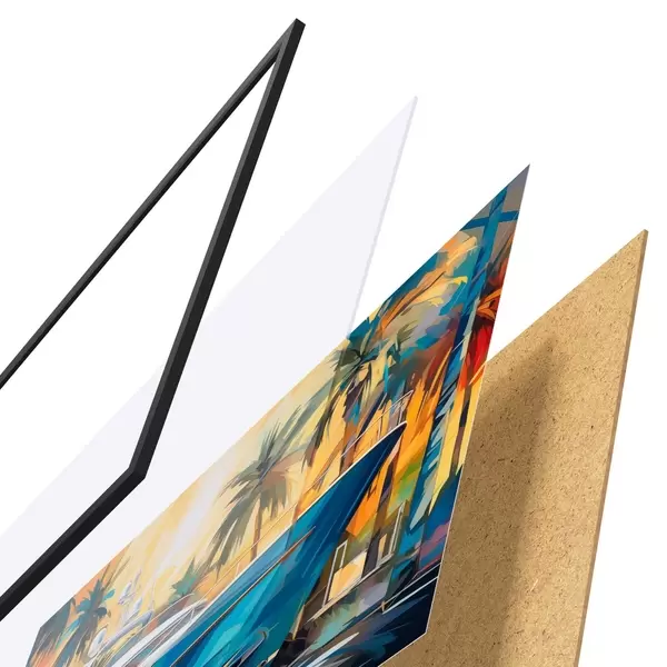 Das Poster besteht aus einem Rahmen, Plexiglas, einem gedruckten Bild und einer Rückwand aus Spanplatten. Dank der Halterungen auf der Rückseite kann das Poster sofort an die Wand gehängt werden.