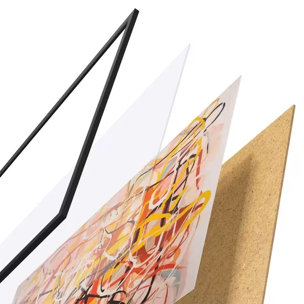 Das Poster besteht aus einem Rahmen, Plexiglas, einem gedruckten Bild und einer Rückwand aus Spanplatten. Dank der Halterungen auf der Rückseite kann das Poster sofort an die Wand gehängt werden.