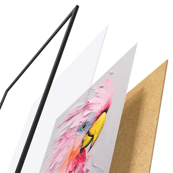 Das Poster besteht aus einem Rahmen, Plexiglas, einem gedruckten Bild und einer Rückwand aus Spanplatten. Dank der Halterungen auf der Rückseite kann das Poster sofort an die Wand gehängt werden.