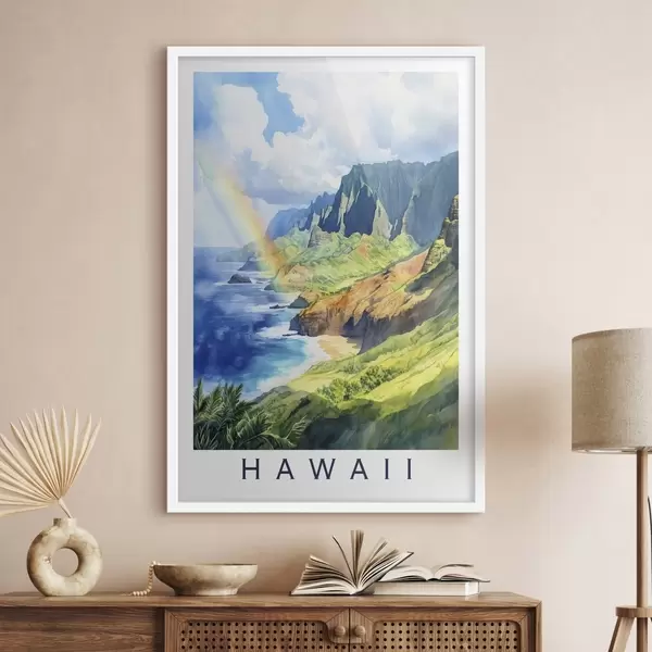 Poster Insel Hawaii, Aquarellstil, Regenbogen, grüne Berge, Meer f44141