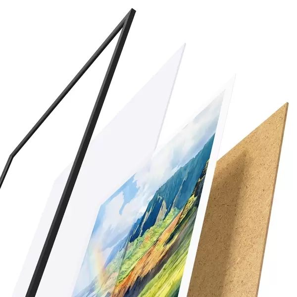 Das Poster besteht aus einem Rahmen, Plexiglas, einem gedruckten Bild und einer Rückwand aus Spanplatten. Dank der Halterungen auf der Rückseite kann das Poster sofort an die Wand gehängt werden.