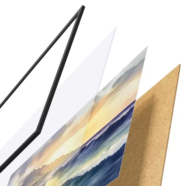 Das Poster besteht aus einem Rahmen, Plexiglas, einem gedruckten Bild und einer Rückwand aus Spanplatten. Dank der Halterungen auf der Rückseite kann das Poster sofort an die Wand gehängt werden.