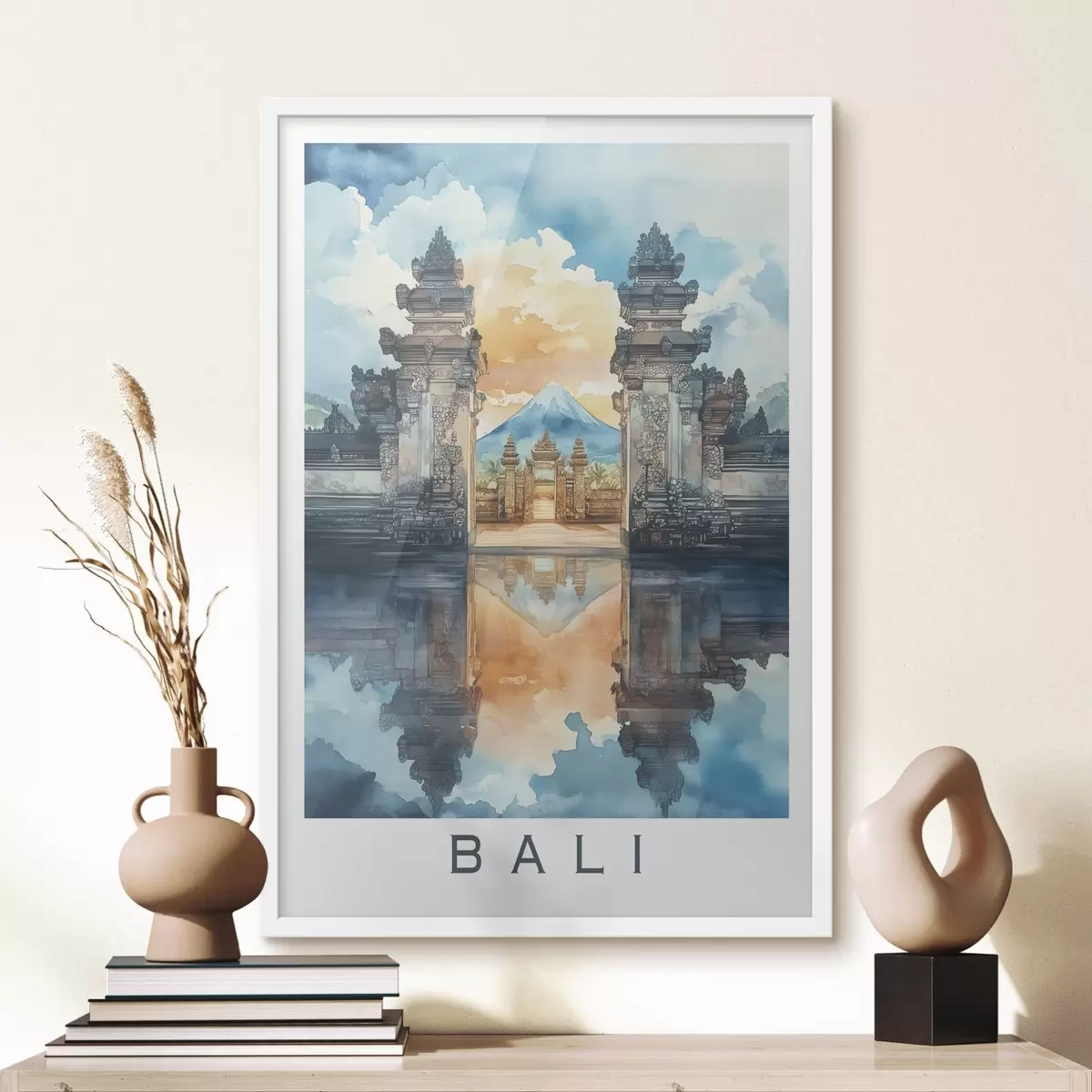 Poster Bali Ästhetik, Tempel, Sonnenuntergang Himmel, tropische Natur, Aquarell-Stil f44149