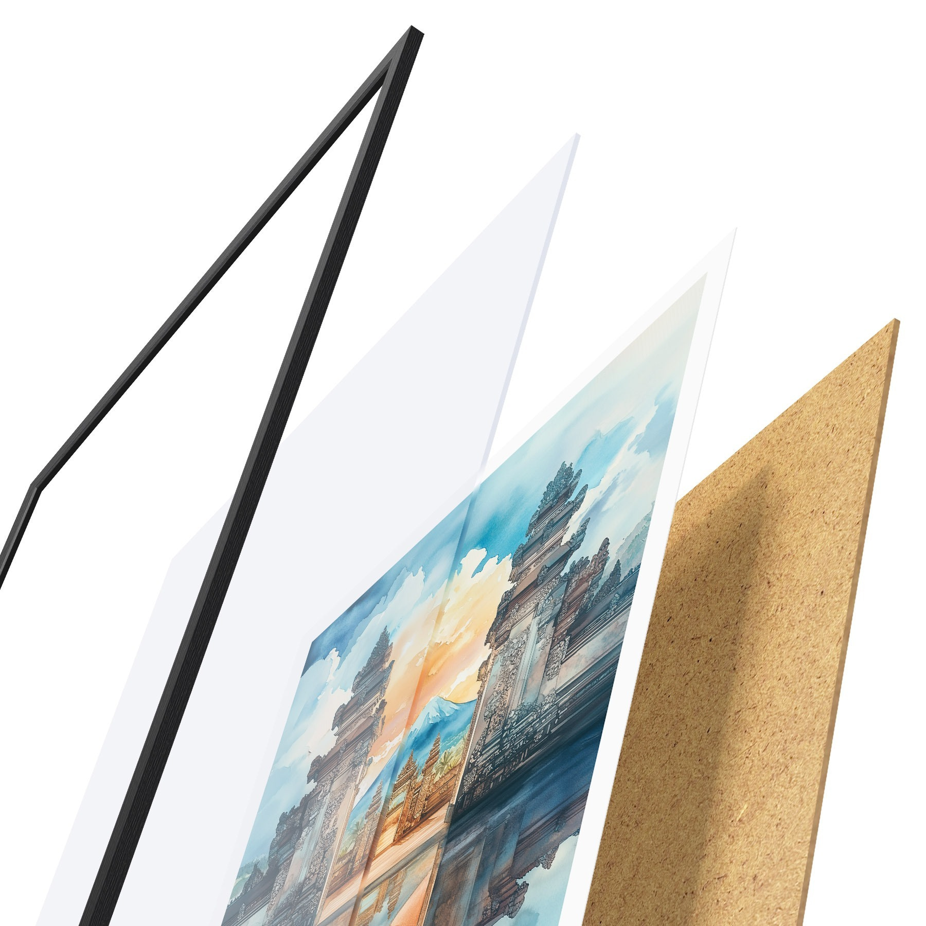 Das Poster besteht aus einem Rahmen, Plexiglas, einem gedruckten Bild und einer Rückwand aus Spanplatten. Dank der Halterungen auf der Rückseite kann das Poster sofort an die Wand gehängt werden.