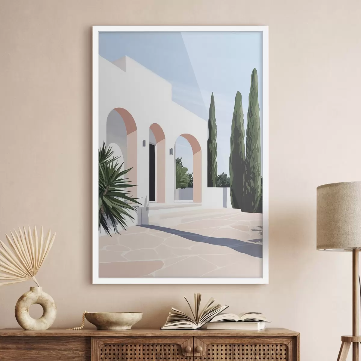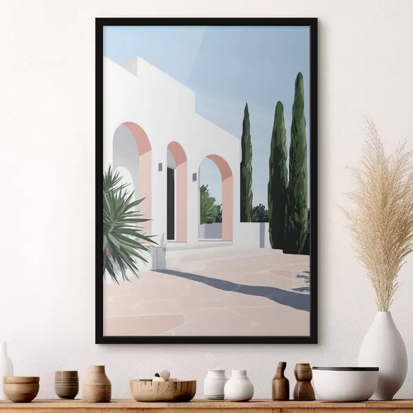 Poster Weiße Villa mit Bögen und tropischem Garten, mediterraner, flacher Stil Nr f44153