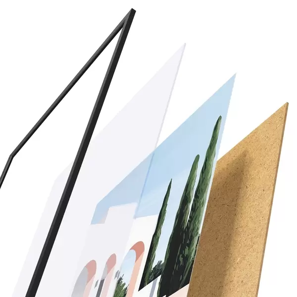 Das Poster besteht aus einem Rahmen, Plexiglas, einem gedruckten Bild und einer Rückwand aus Spanplatten. Dank der Halterungen auf der Rückseite kann das Poster sofort an die Wand gehängt werden.