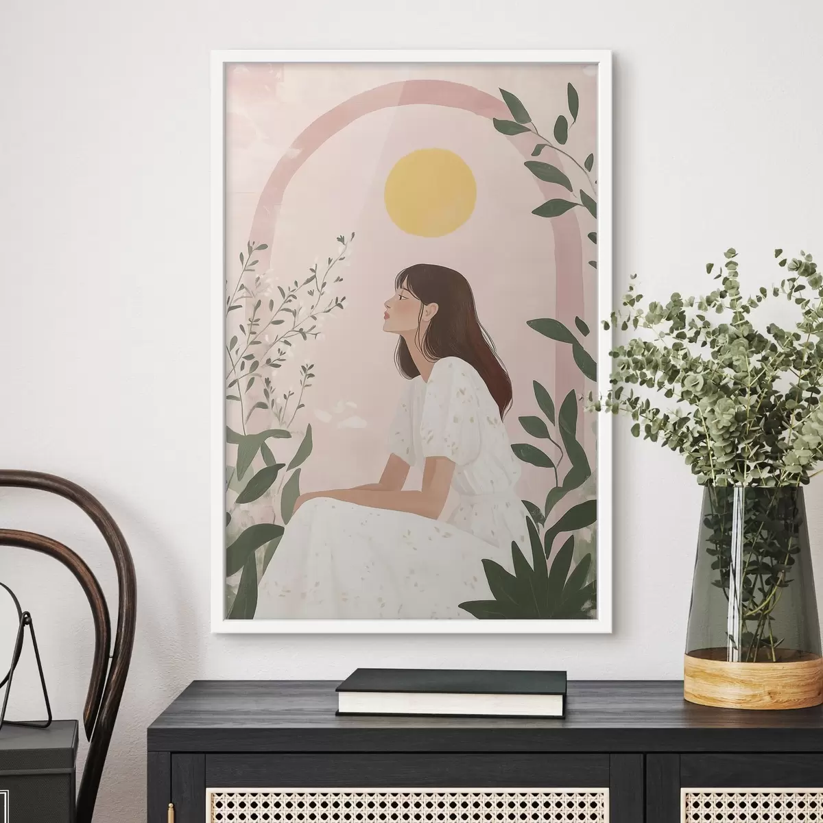 Poster Schöne Frau im tropischen Garten, Sonne, Pastellfarben Nr f44155